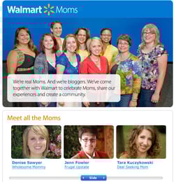 Walmart is a shining example of this, with their Walmart Moms program. They provide real moms the opportunity to blog about a topic which interest them, and is relevant to Walmart's core demographics. Walmart showcases these blogging moms on their corporate website, with an attractive and easy to use slider interface, which identifies each blogger by name, a picture, their chosen topic, and an embedded link to their individual blogs. By doing so, they represent these moms as experts in their chosen subjects, and provide an opportunity for increased traffic (and better search rankings!) by linking to their blogs from the Walmart.com website.